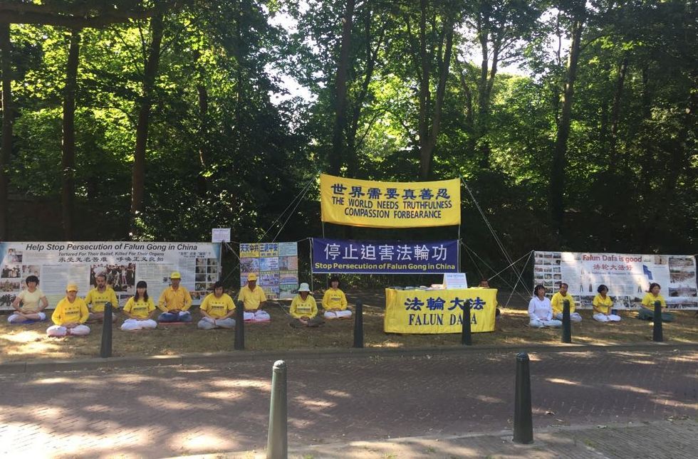 即使海牙的夏天艳阳高照,中领馆前依然阴冷照旧。一大早,学员们摆好各种横幅展板后,开始平静地炼功,并向使馆区附近工作和居住的人讲述法轮功的故事。