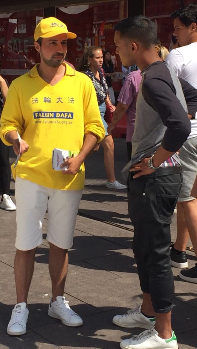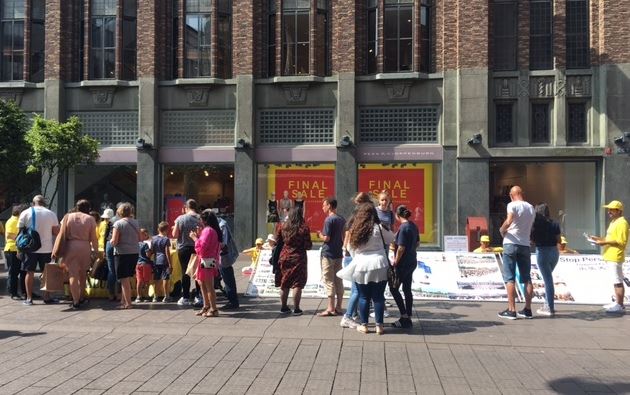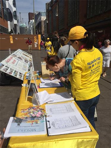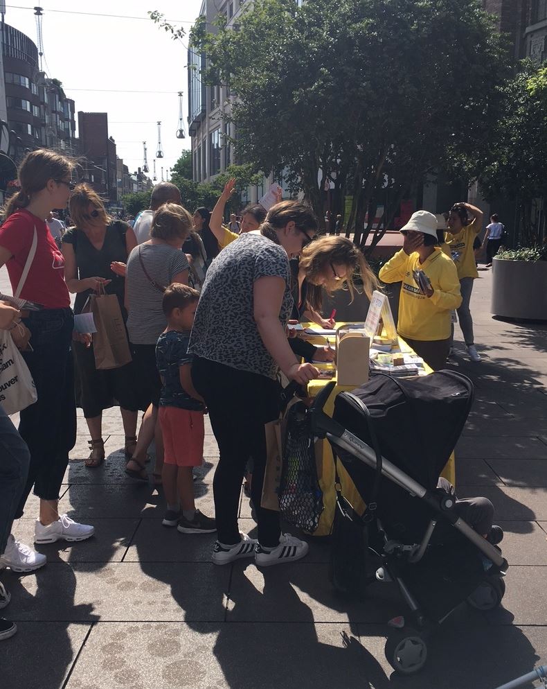 刚刚从中国来到荷兰的张女士和女儿是第一次参加公开的反迫害活动,心情异常激动。她讲述了在国内被迫害的经过,由于修炼法轮功三次被绑架、遭酷刑迫害。二零一七年十九大召开之前,迫害部门为了达到抓捕和转化人数的目标,强制她签字放弃修炼法轮功,遭到拒绝后对她严重殴打,用抻刑,上 她说:“法轮大法数次救了我的命。灌食的时候我两次停止呼吸,医院的医生认为我已经不行了。但是每次我又恢复了呼吸和心跳。在很难的时候,我就抱着这一念,让我签保证书绝不可能,我死就死了,要是我还能活着,什么都不可能阻挡我讲清法轮功真相。” 民众支持反迫害 二十日下午,在海牙最繁华的街区,法轮功学员黄色的T恤在阳光下格外耀眼,悠扬的炼功音乐和平静的内心也给吵闹的街市带来一份清净。行人或者三三两两在展板前驻足观看,或者聆听学员讲述法轮功的故事,或者排队去签字反迫害。 市民Patricia走向学员,表示站在这里感到很平和。当听到法轮功被中共迫害后,她说道:“遭受十九年的迫害非同一般,一年就已经太长了。”她表示:我不能接受中共向人们施压,每个人都应该有修炼法轮功的权利。“我生长在自由的环境,我可以说我想说的,做我想做的,全世界的人都应该有这种权利。”