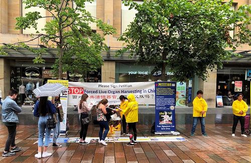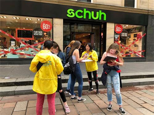 【明慧网二零一八年七月二十七日】二零一八年七月二十日,淅沥沥的下着小雨,苏格兰各地法轮功学员聚集在格拉斯哥市中心,向过往群众耐心讲述中共迫害法轮功,活摘器官真相。当天格拉斯哥小雨未断,但是法轮功学仍坚持到活动结束,一直冒雨向民众展示大法祥和的功法,整个场给人以温暖的感觉。