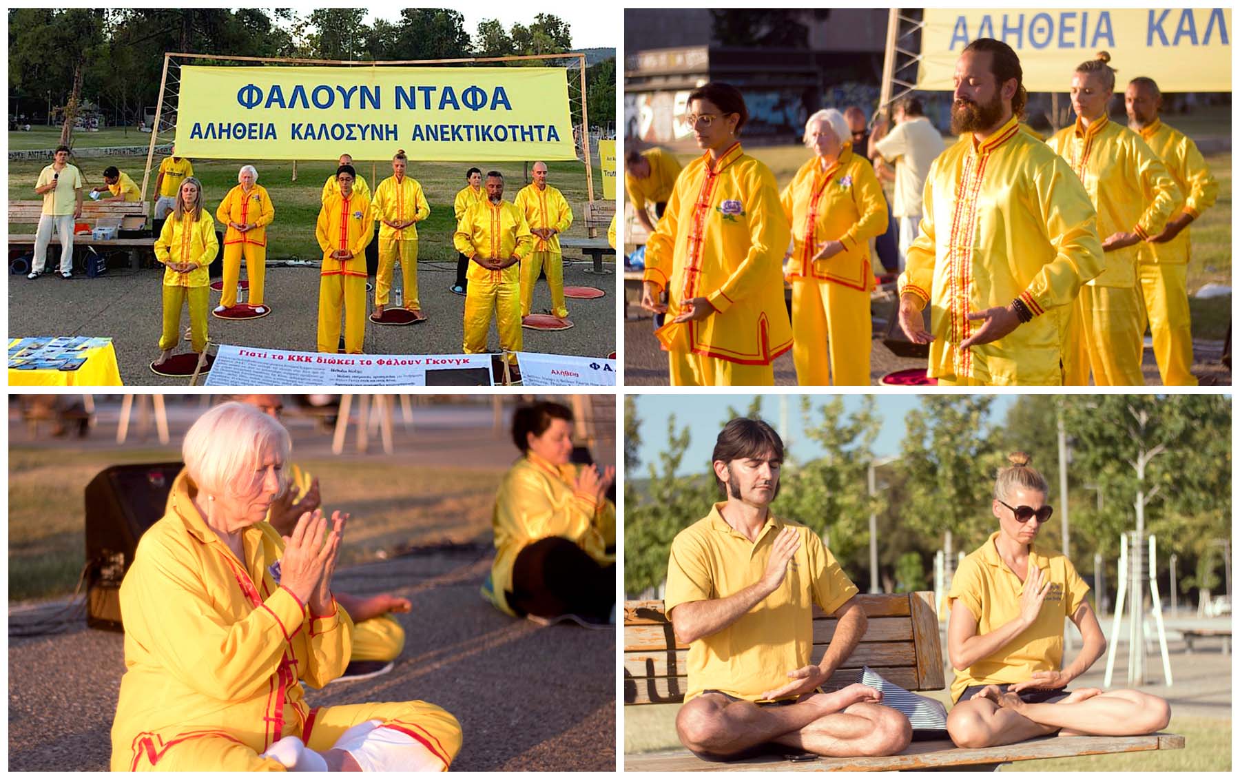 法轮功学员在希腊第二大城市塞萨洛尼基海港中心的著名海岸“lefkos pirgos”举办活动,介绍功法。