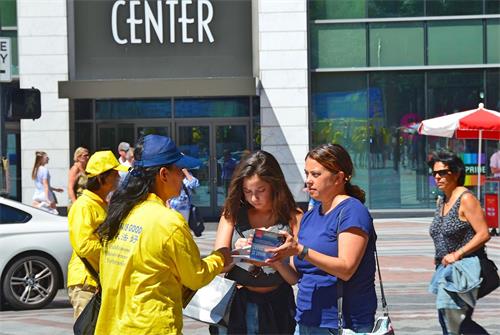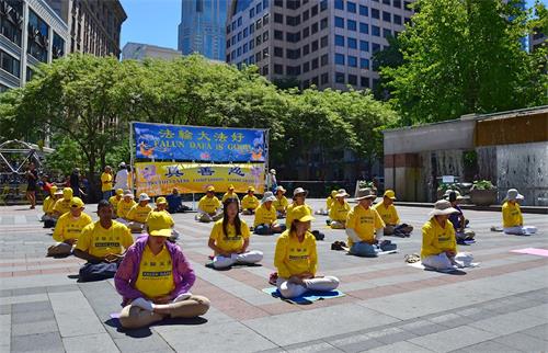 几十位身穿黄色T恤的中西方法轮功学员在祥和的炼功音乐下展示法轮功的五套功法,成为喧闹的西雅图市中心的一道宁静的风景。他们的平和与优美的炼功动作吸引着路人,许多路人停下来拍照。也有的或阅读展板,或与学员攀谈,了解真相。