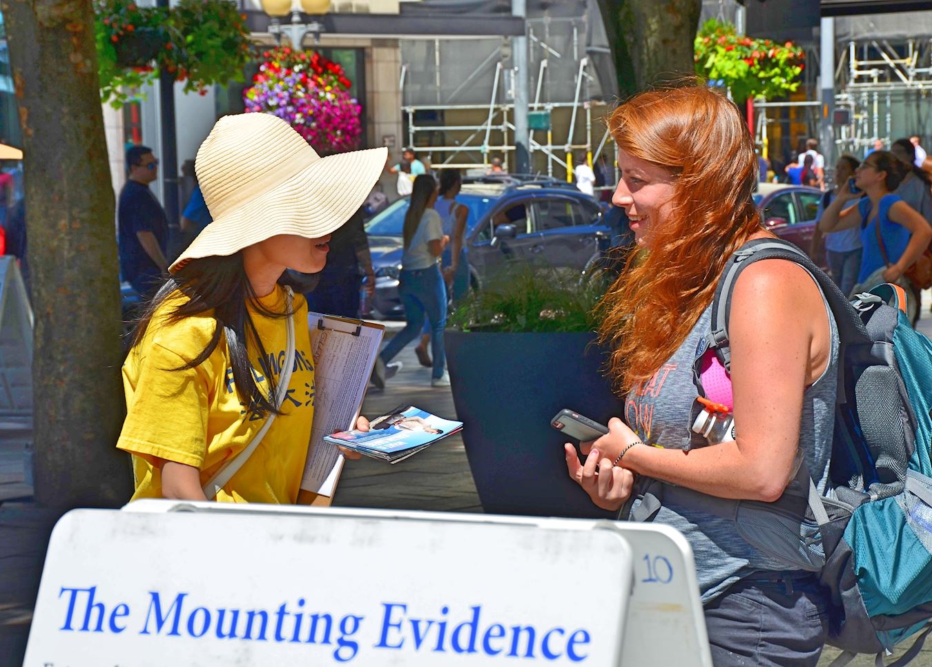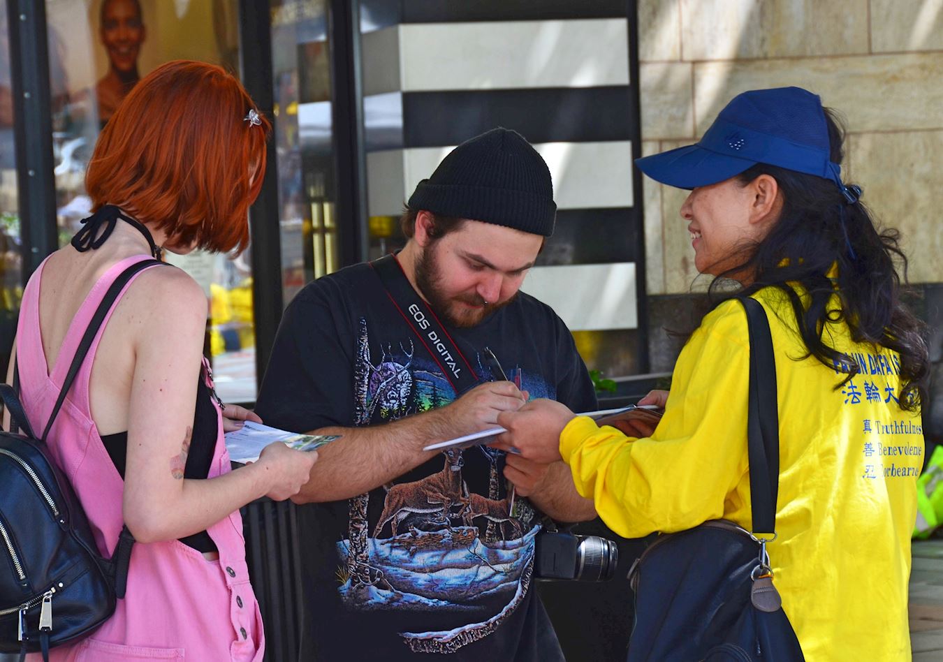 另一对年轻人阅读了真相展板后,向法轮功学员询问有关于迫害的具体情况。在他们听到在中国大陆居然有活摘器官的事情发生后,他们表示,这种行为既不人性也不人道。随后两人在制止活摘的征签表上签名,并表示他们会告诉他们的亲朋好友。他们希望能通过这样方式帮助制止迫害。