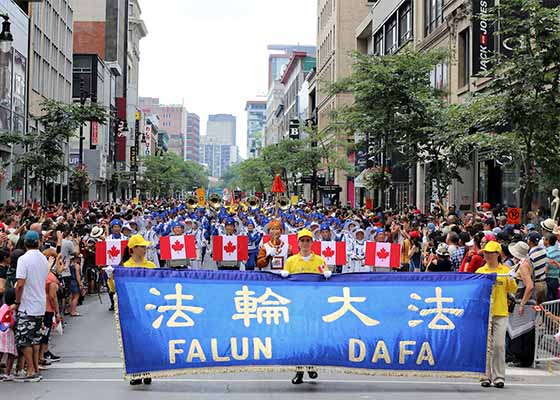 7月1日,蒙特利尔人顶着酷暑庆祝加拿大151周年国庆。在浩浩荡荡的游行长龙里,由法轮功学员组成的队伍,受到民众赞赏,有华人称赞“法轮功的队伍最壮观”。
