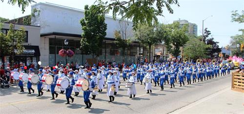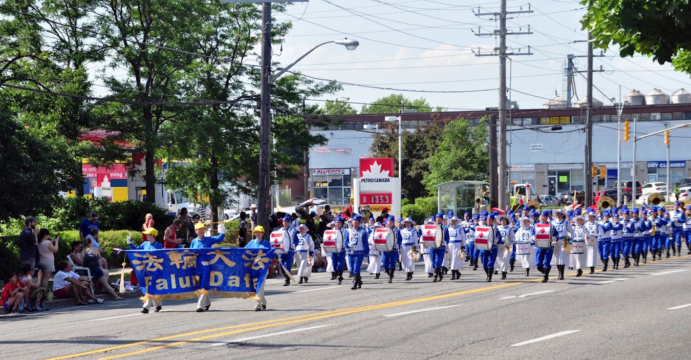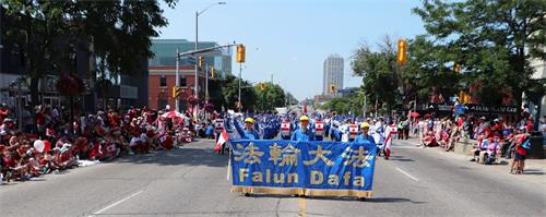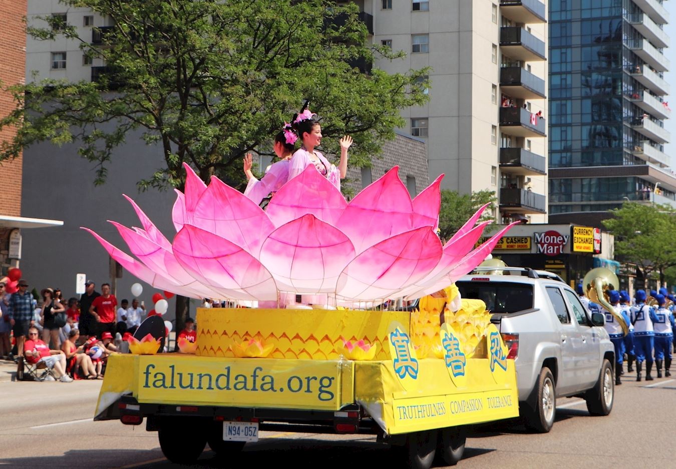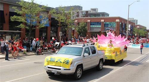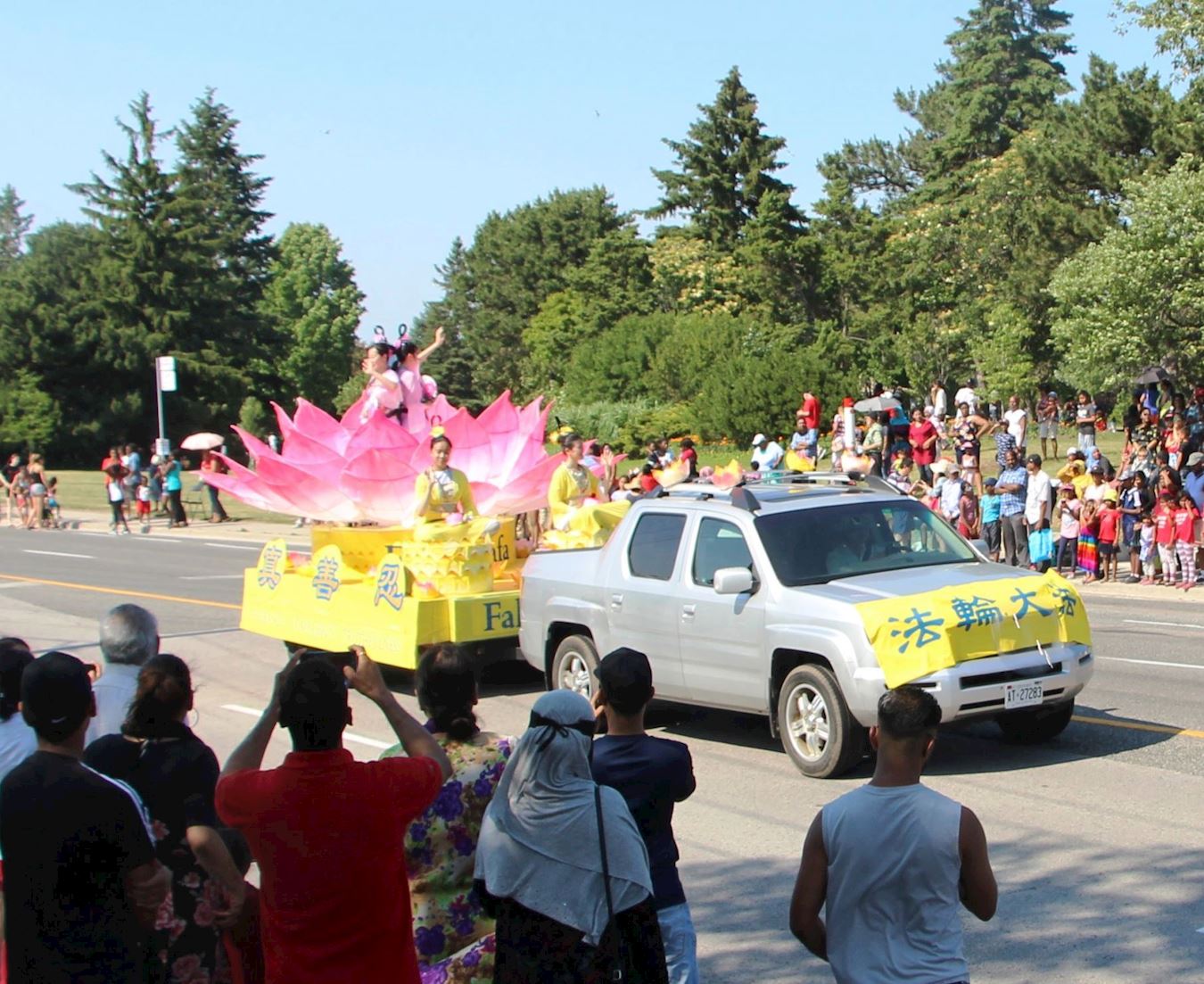 【明慧网二零一八年七月三日】(明慧记者章韵多伦多报道)二零一八年七月一日是加拿大国庆日,全加拿大各个城市都在这一天举行活动庆祝第151周年国庆。多伦多法轮功学员的天国乐团和莲花花车当天应邀参加了两个城市的大游行,上午十一点参加了在密西沙加市的游行;下午两点赶去参加在多伦多市士嘉堡的国庆游行。观众称赞法轮功队伍在这特别的日子展现美好与平和,感谢他们在炎热的一天里给人们带来了愉快!