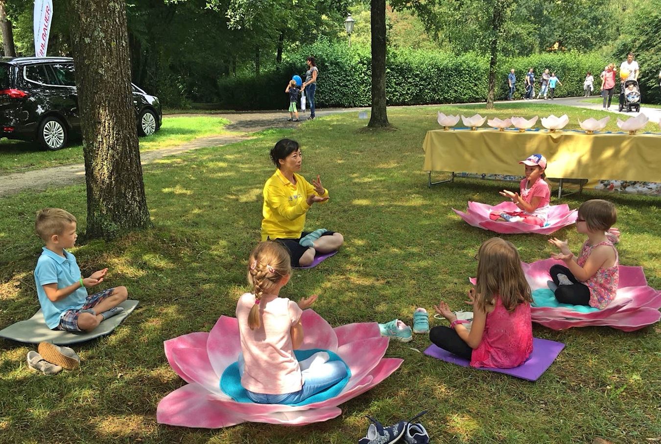 法轮功的能量场好像磁铁一样,吸引着儿童节的大小游客。还有一位孩子的妈妈认识到法轮功的益处,问学员是否能去小学教功。她打算找小学校长,要求让孩子们都学一学法轮功。