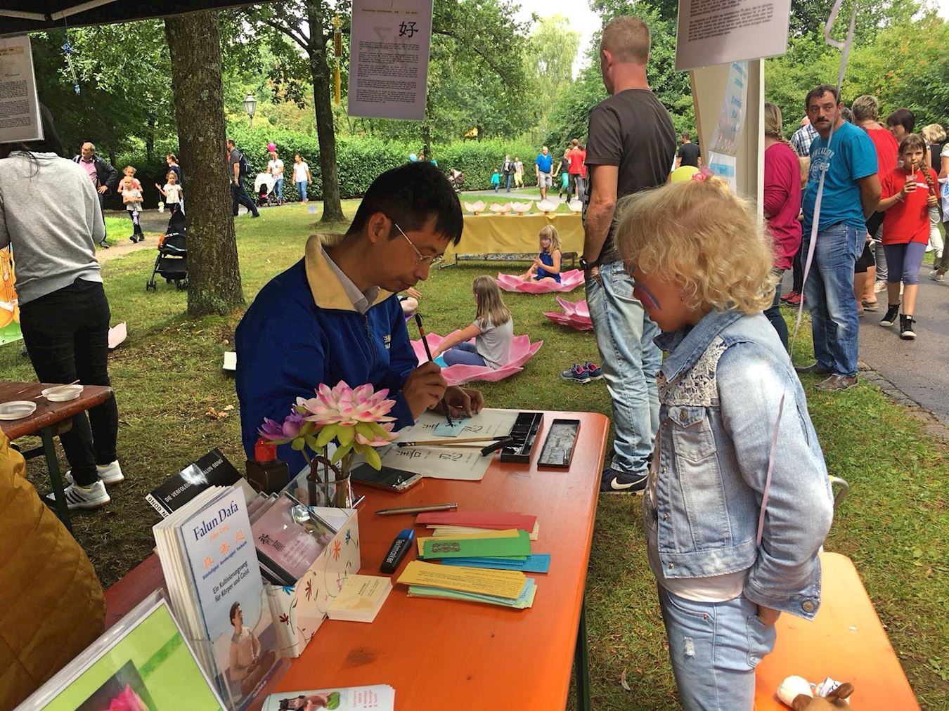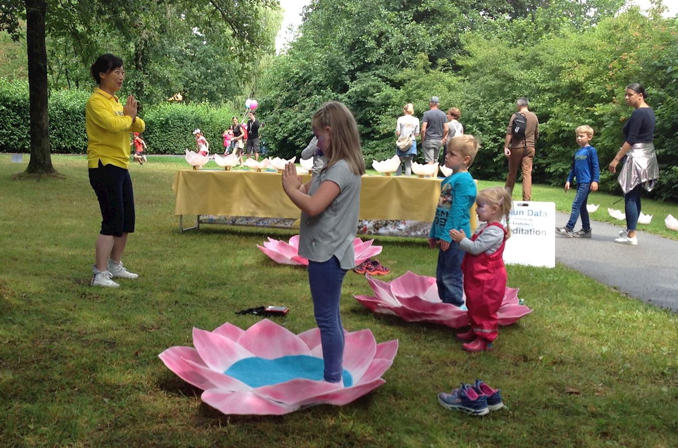 ![]() 图1:二零一八年七月二十二日,德国巴特克茨廷法轮功学员应邀参加巴伐利亚中部报社(Mittelbayerische Zeitung) 该市疗养公园(Kurpark)举办的儿童节,为孩子和家长提供免费教功。 |