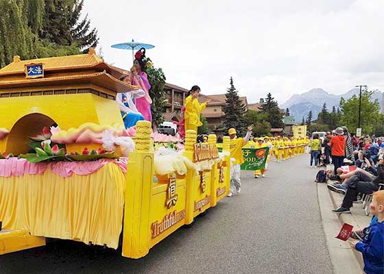 七月一日,法轮功学员的花车队伍第三次参加班芙小镇国庆日游行活动,向数十万游客展现大法的美好,为游客们带去大法真、善、忍的福音。