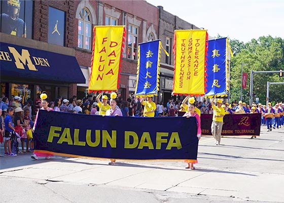 七月四日,法轮功学员参加了密西根州安娜堡独立日游行,受到两旁人群的欢迎,许多人合着法轮大法好的音乐拍手欢呼。