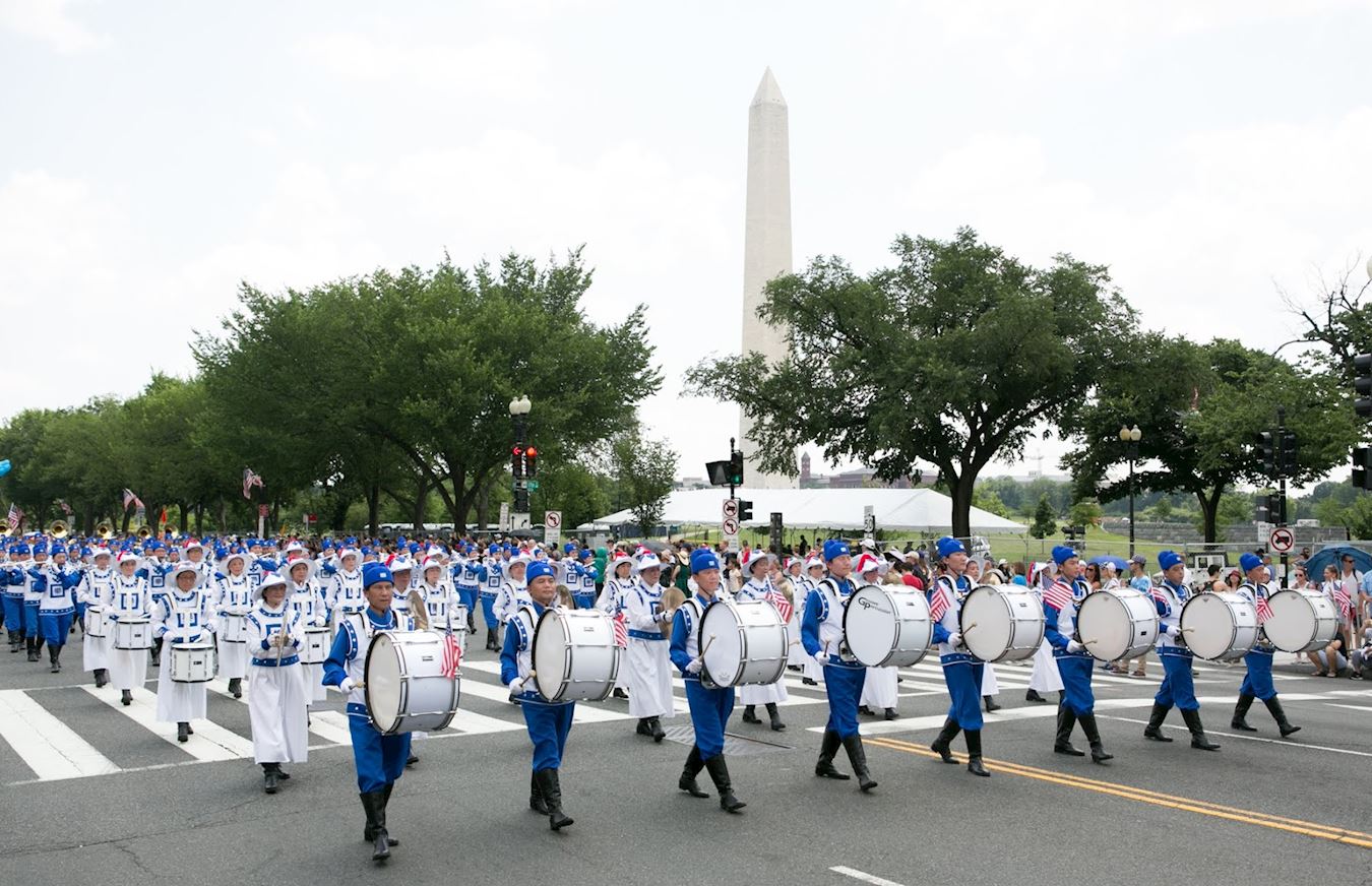 【明慧网二零一八年七月五日】(明慧记者夏延初美国华盛顿特区报道)“法轮大法团体为大家带来从纽约市来的天国乐团!该团拥有160名志愿成员,他们都修炼法轮功,并从修炼中得到灵感。该乐团获得热烈的欢迎及掌声。他们被要求再次参加游行演出。”天国乐团经过华盛顿纪念碑时,主办方如此介绍。这是天国乐团连续第十三年受邀参加一年一度的美国首都独立日游行。