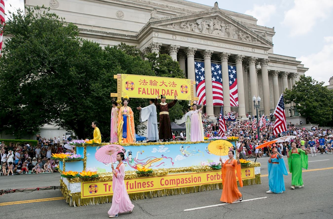 二零一八年七月四日,尽管天气炎热,人们兴致不减。成千上万的人聚集在华盛顿特区的宪法大道上,观看有120个团体参加的盛大游行。主办方继续介绍:“法轮大法,也叫法轮功,是秉承真善忍原则的古老的身心灵修炼方法。一九九二年法轮功首次被介绍给公众。自此,法轮功为超过80个国家的上亿人带来身心健康。”