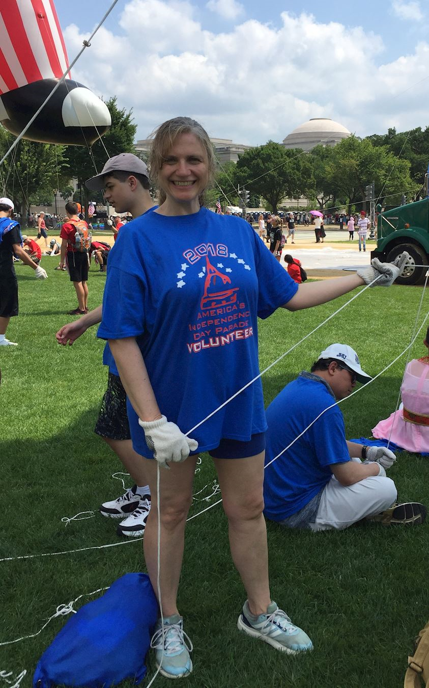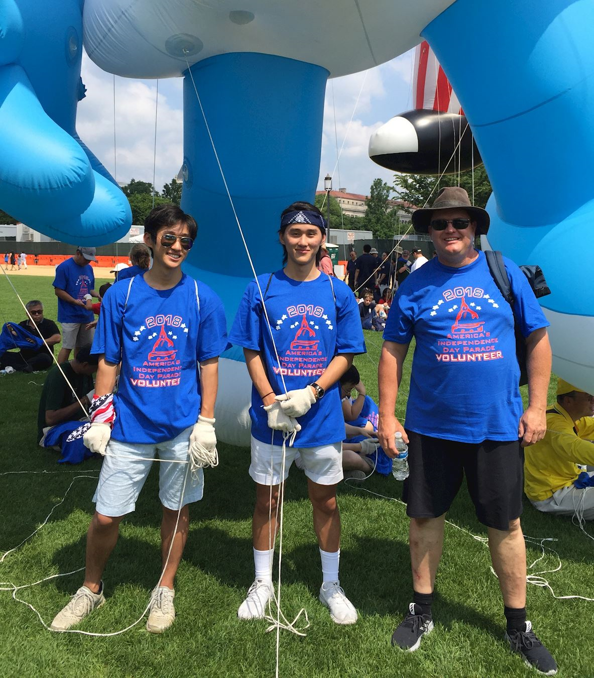 除参与天国乐团和精美的花车外,还有一部份法轮功学员作为义工帮助主办方拉一个巨大的“蓝妹妹”卡通气球。廖西文和廖海成这对孪生兄弟就是其中的两位。他们目前就读于马里兰大学,将在二零二零年毕业。两位都表示很高兴作为美国人与其他美国人一起参加游行,也可以支持法轮功。