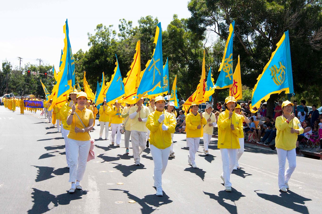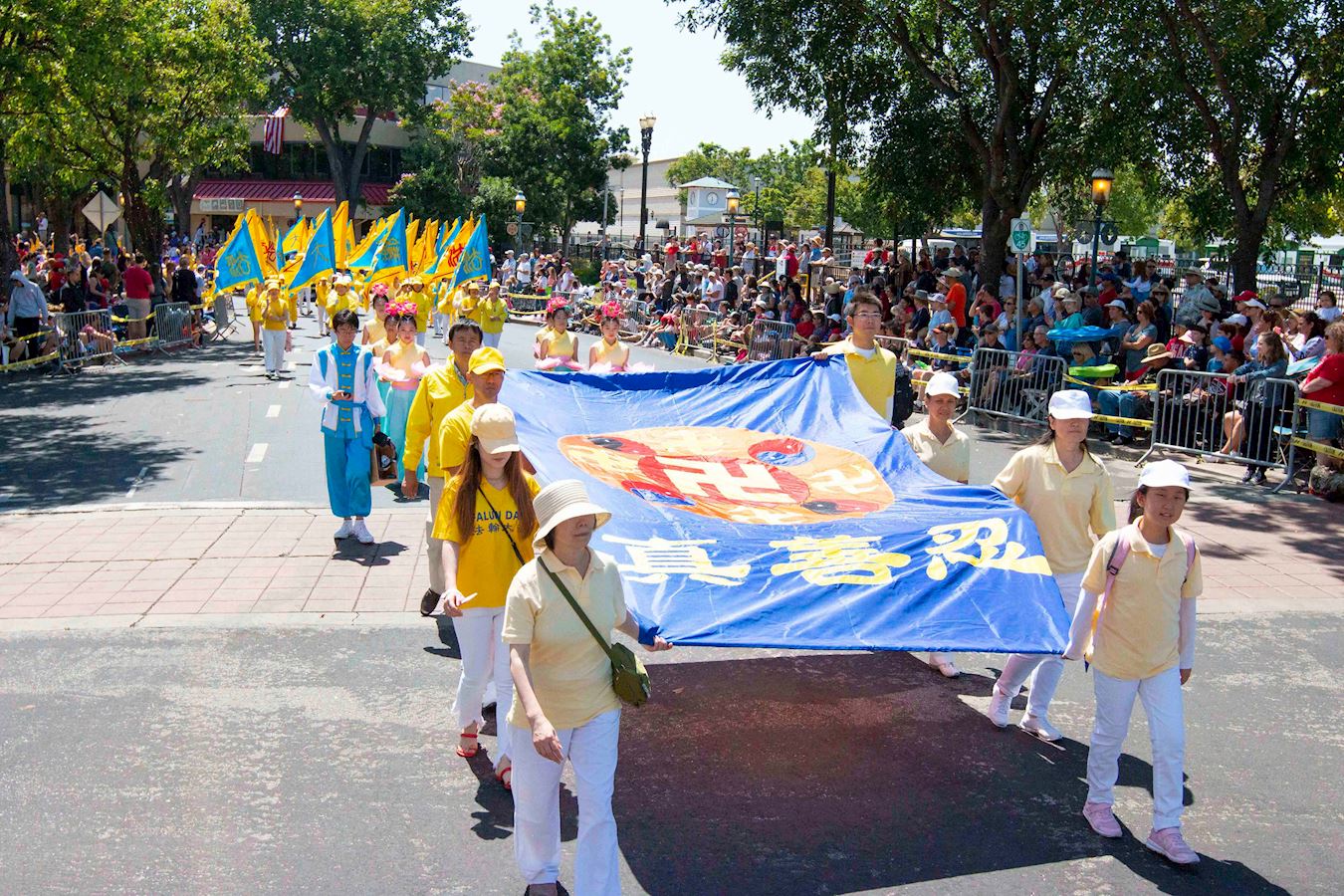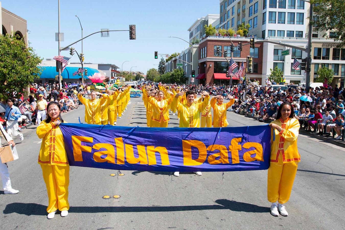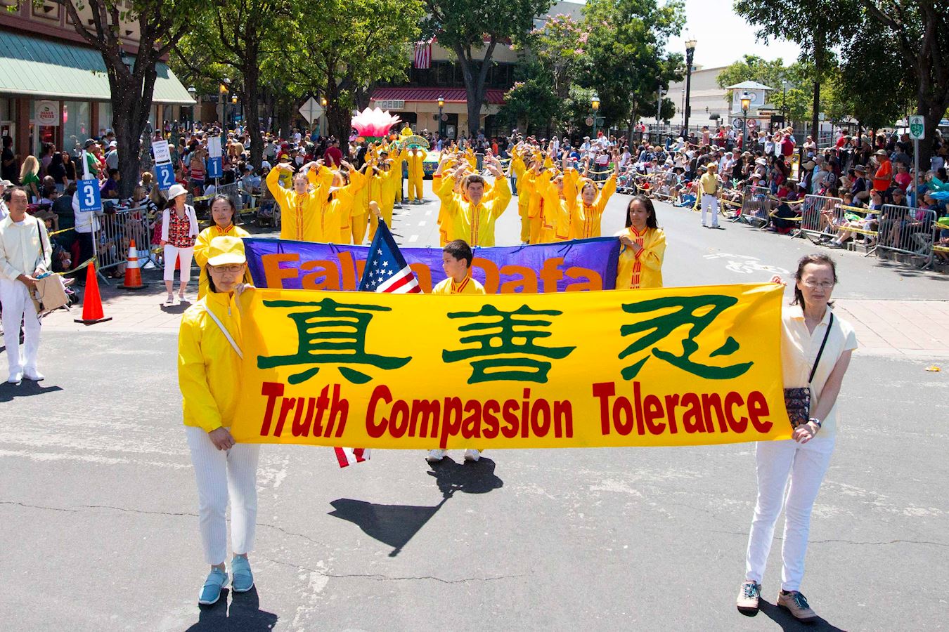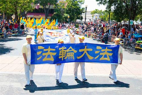 游行队伍经过主席台时,主持人向观众介绍说,现在来的队伍是法轮大法的队伍。法轮大法的原则是真、善、忍,包括打坐和缓慢的功法,在世界各地一百多个国家都有人炼法轮功,千百万的人炼功后获得了身心健康。