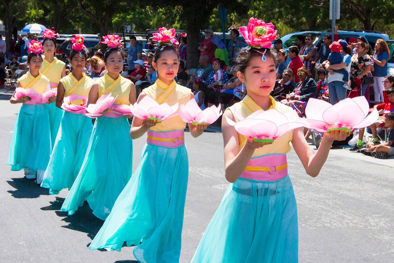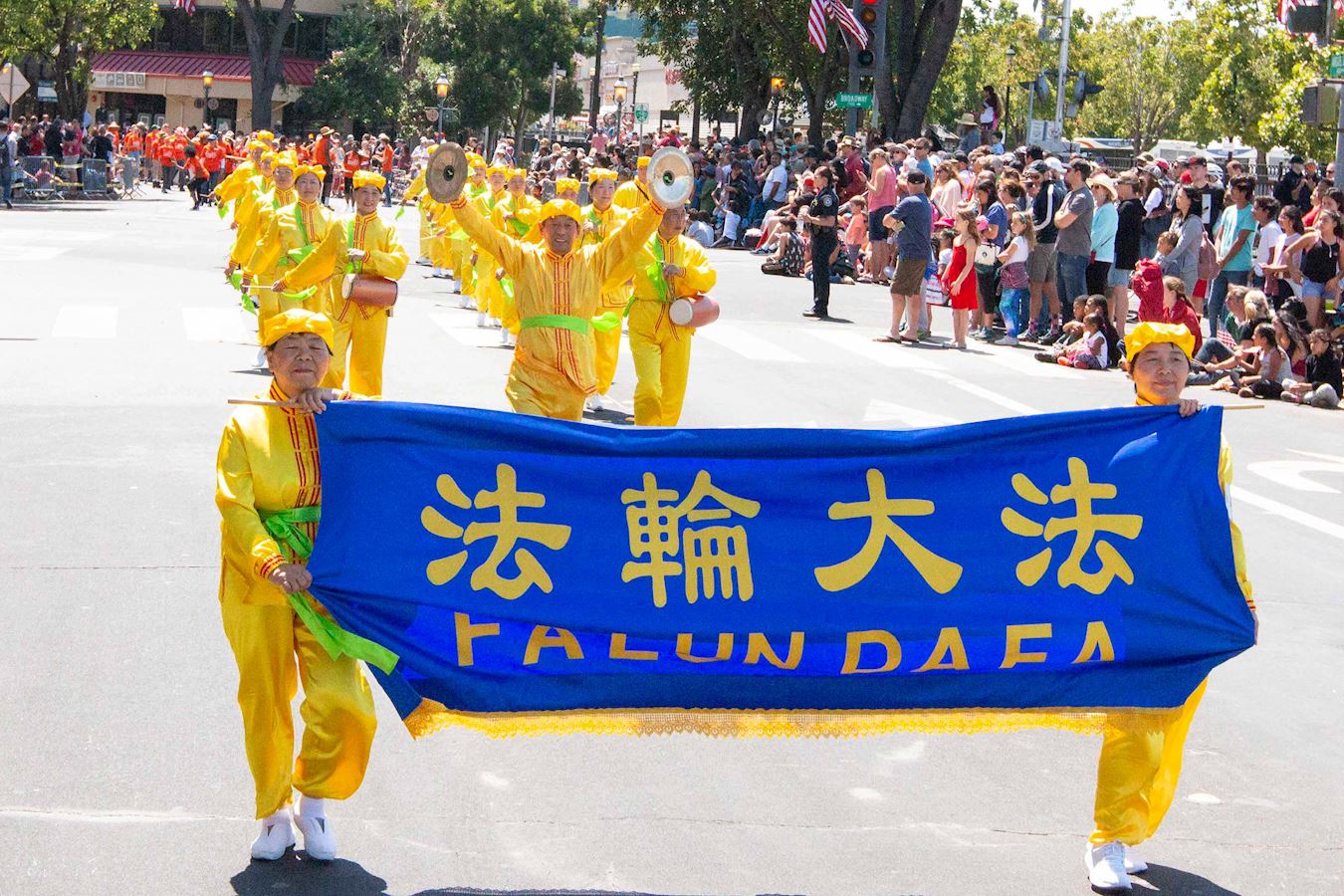 上午十一点四十五分,游行队伍从宪法大道和七街交界的起点出发。法轮功学员的游行队伍由天国乐团和花车组成,还有二十五位法轮功学员受主办方之邀手持巨大的卡通人物气球。天国乐团成员身着色彩清新明亮、设计新颖的传统宫廷乐团服饰,格外醒目,与众不同,成为游行中一道独特景观。他们演奏了《法轮大法好》、《神圣的歌》、《法正乾坤》、《凯旋》、《送宝》、《法鼓法号震十方》、《法轮圣王》、《佛恩圣乐》八首原创乐曲,还特别为美国独立日游行准备了一曲《星条旗永不落》。在十几个街区的游行路线沿途,层层叠叠的民众为法轮功学员鼓掌喝彩。