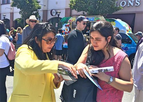 于是学员跟她介绍了法轮功是什么,并告诉她,目前世界上有上亿人在炼,不过在中国却发生着中共对法轮功学员的残酷迫害。凯丽很惊讶,惊呼正在阅读介绍法轮功的传单的丈夫门森先生。门森先生回应:“是啊。我正在阅读传单,正好看到这部份(迫害)的介绍。那非常恐怖。”