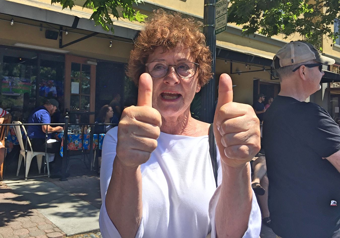 ![]() 图19:看到法轮功学员的队伍,来自德国的玛莱琳纳(Mrienne)不太会说英文,竖起两个拇指夸赞。学员告诉她,在德国也有很多人修炼法轮功,法轮大法的网站有德语的介绍。她非常高兴,用力点头。 |