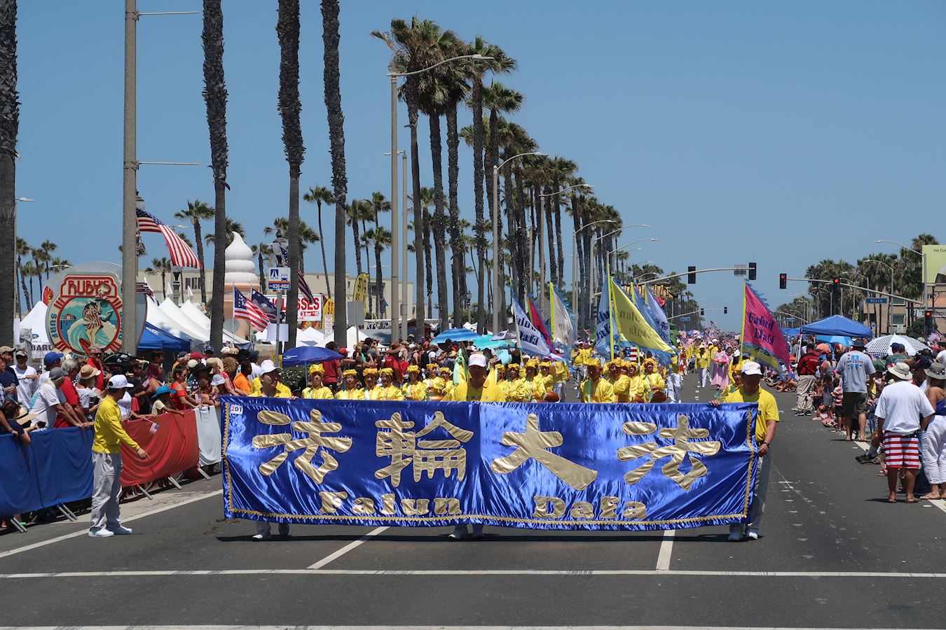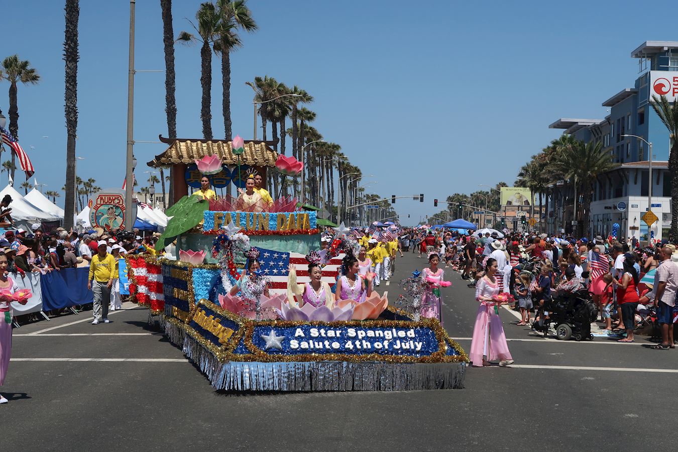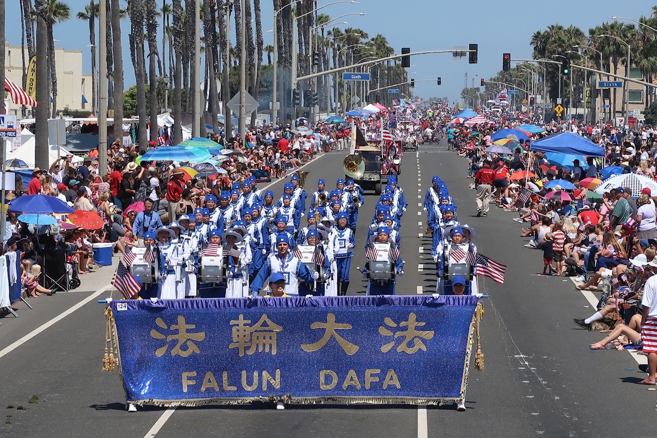 【明慧网二零一八年七月六日】七月四日是美国独立日,也是美国国庆节。美国西部杭庭顿海滩市(Huntington Beach)每年都会举行国庆节游行,这是美西最大规模的游行,今年已是第一百一十四届。今年游行的主题是“星光璀璨的致敬”(A Star-Spangled Salute),游行于早上十点开始,两百多个由花车、仪队、马车、乐队所组成的队伍从太平洋海岸1号公路转缅因街(Main Street)游行,全程约四英里,沿途观众多达十几万人。
