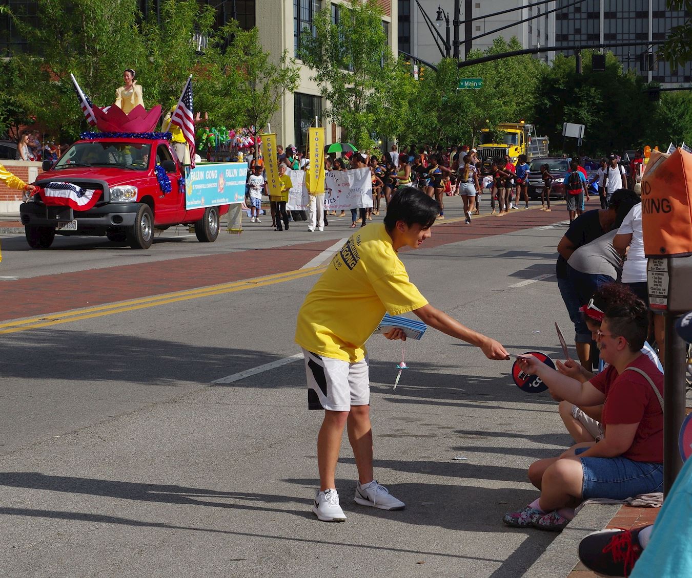 游行队伍经过时,前来观看独立日游行的当地居民纷纷接过法轮功学员递上的真相传单,都想更多了解一下关于法轮功的信息。人们不断地向法轮功游行队伍招手致意。坠有纸折莲花的小书签更是小朋友们的最爱。