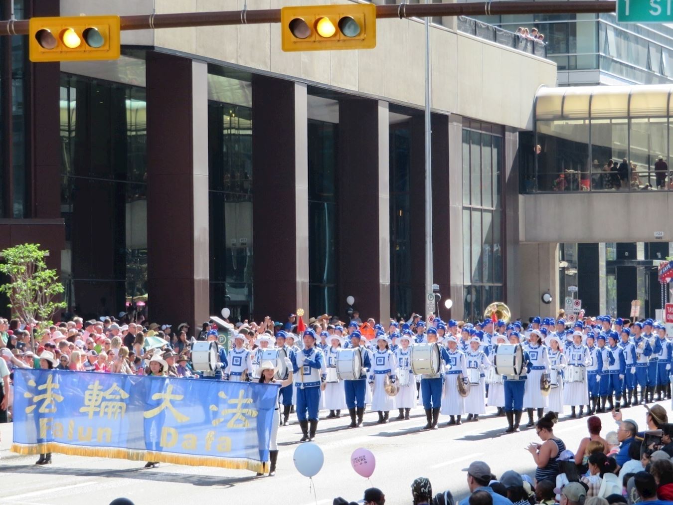 加拿大广播公司(CBC)的电视转播中,主持人向观众介绍天国乐团的服装风格源自中国古代唐朝乐官的服饰,称赞法轮大法的队伍太美了,而且色彩丰富(so beautiful, so colorful),非常吸引人。主持人还介绍:法轮大法又称法轮功,是古老的修炼方法,能使人改善身心健康,炼功动作舒缓优美,在世界各地有上亿人在修炼。