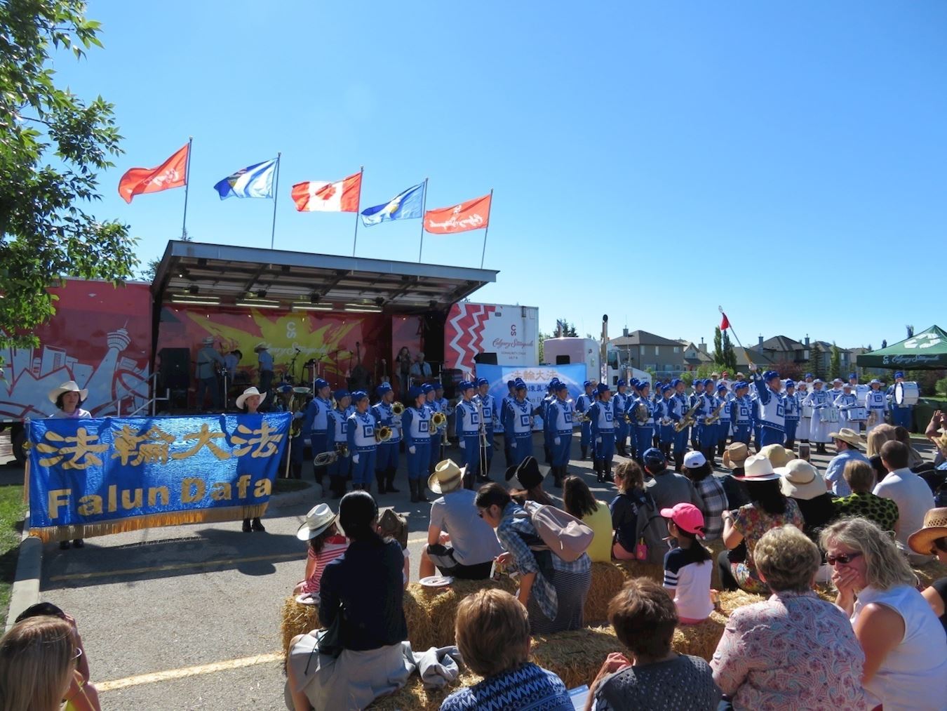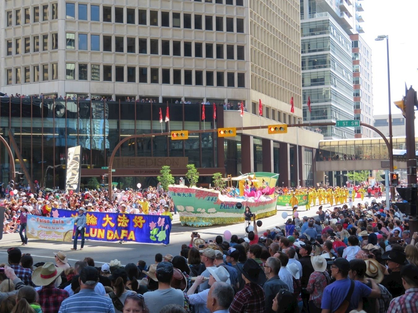 来自当地和自温哥华、多伦多、渥太华和旧金山的法轮功学员也参加了牛仔节开幕式游行。法轮功学员的天国乐团、大法船造型的花车、腰鼓队精彩的表演,赢得了观众阵阵热情的掌声,许多人竖起大拇指,很多人合十致意。