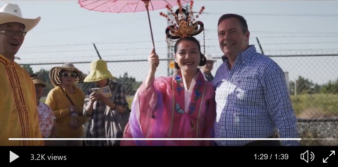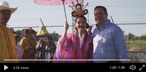 加拿大联合保守党领袖杰森·康尼(Jason Kenney)在开幕游行前来到游行起点,与部份参加游行的法轮功学员合影,并与法轮功学员一起高呼:“法轮大法好!”