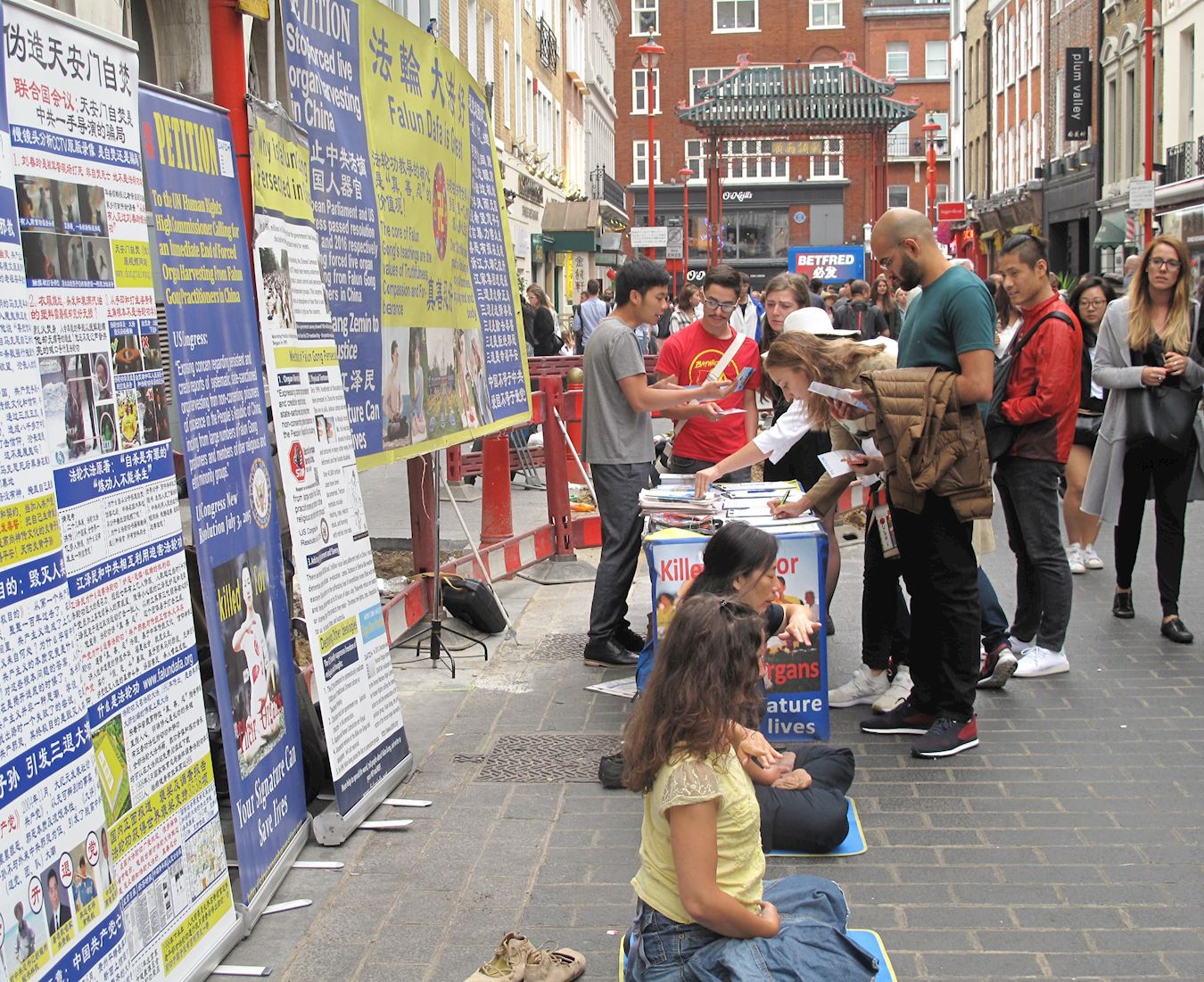 ![]() 图1~2:二零一八年八月十一日,法轮功学员在伦敦唐人街炼功、发真相传单、征签反迫害 |