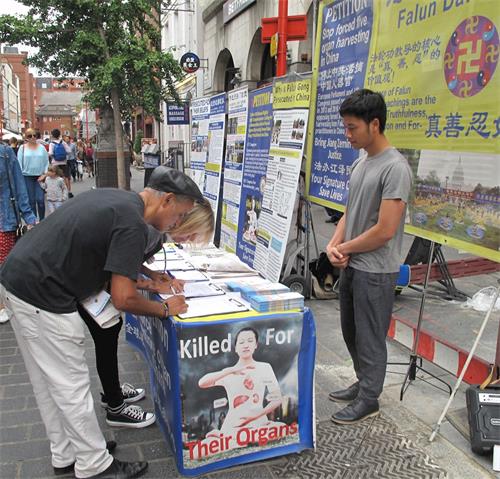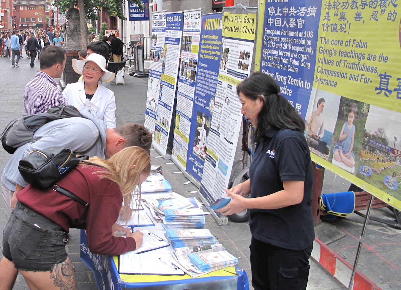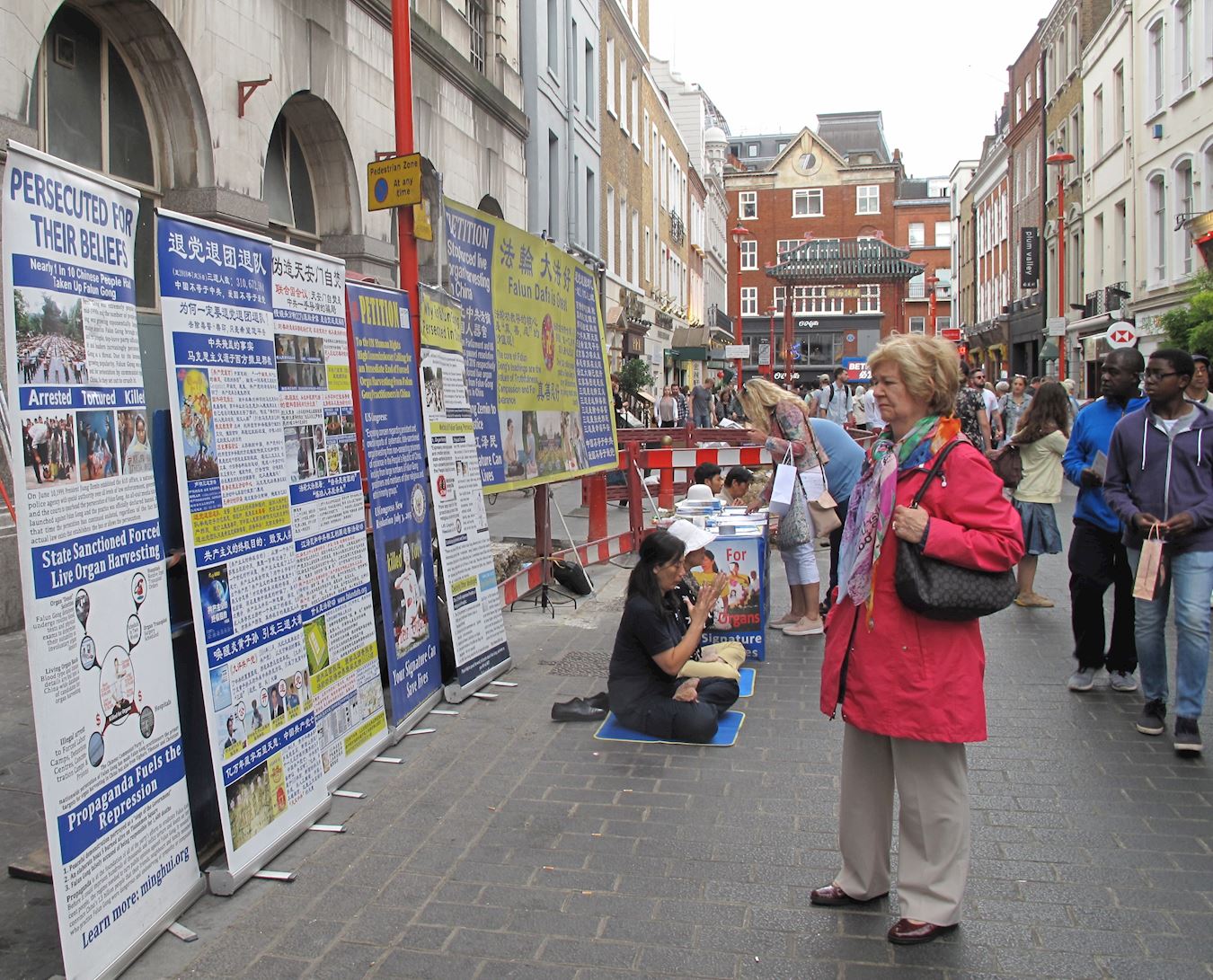 梅根(Morgen)女士从澳大利亚墨尔本来伦敦旅游,在唐人街的人流中停下脚步认真观看法轮功真相展板,她告诉法轮功学员,自己在墨尔本住在中使馆附近,法轮功学员经常在那里举行反迫害活动,她了解真相并曾经签名反迫害,她非常赞成法轮功学员在伦敦唐人街的讲真相活动,她说: