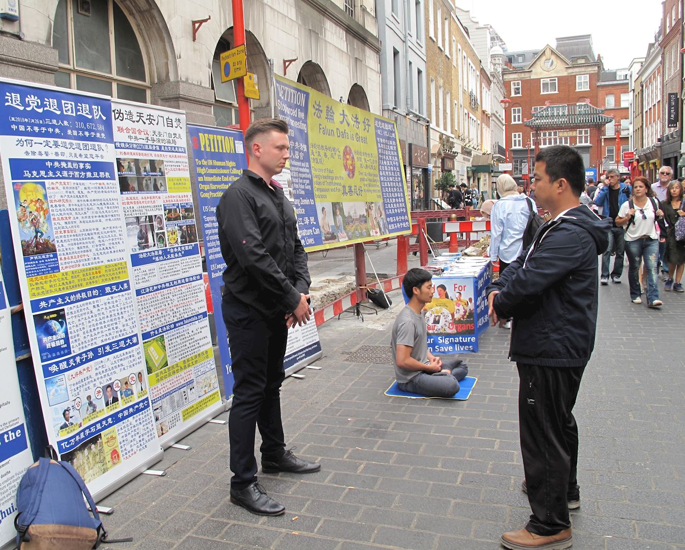 拉菲尔(Rafael)先生已在英国生活十五年,八月十一日和女朋友一起来伦敦唐人街吃饭,这不是他第一次来了,但这次他一看到在真相展板前打坐的法轮功学员,就走过去在一旁坐了下来。