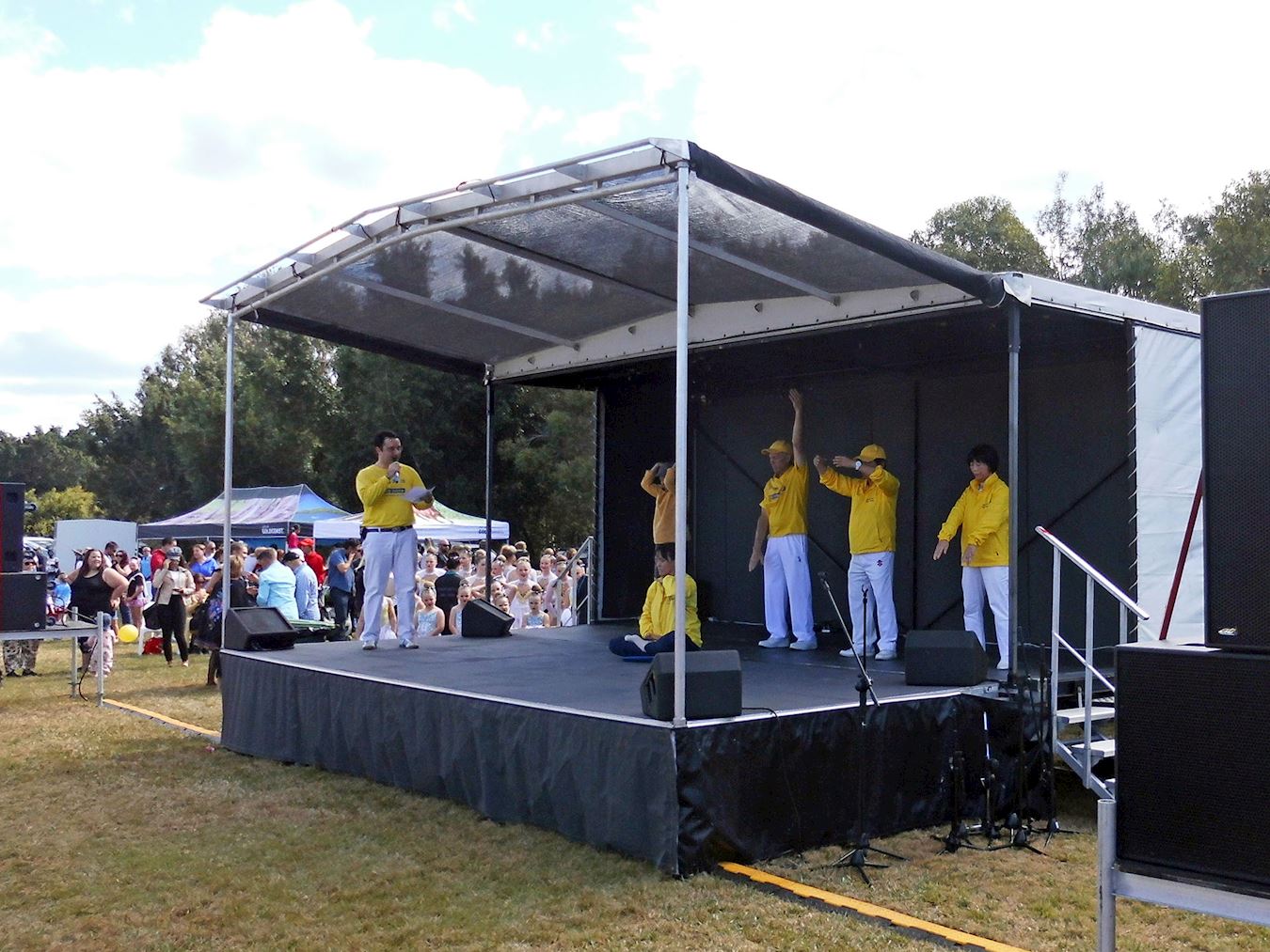 活动组织者还邀请学员上台展示五套功法。观众们认真听着讲解,并给予学员热烈的掌声,以示感谢。司仪还特别提到法轮功学员总是那么祥和友善,并鼓励大家多去了解法轮功。
