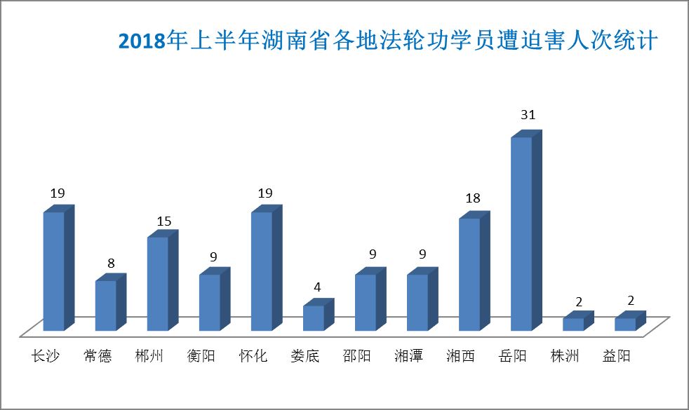 图1:2018年上半年湖南省各地法轮功学员遭迫害人次统计