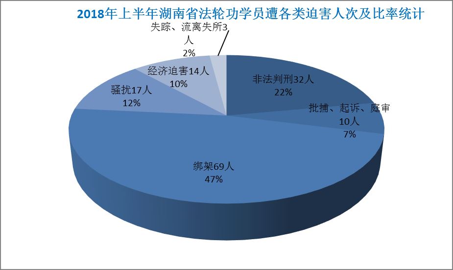 从上述图表,可以清晰地看到,2018年上半年湖南省法轮功学员遭受各种迫害情况:各类经济迫害14人次;失踪1人次;非法判刑32人次;非法庭审4人次;非法起诉5人次;非法批捕1人次;绑架69人次;骚扰17人次;流离失所2人次。据《2018上半年430名法轮功学员被冤判》一文,湖南省被非法判刑的法轮功学员为29人,全国邪恶排名为第五名。由于信息传递不及时,截至8月12日,从明慧网获取的消息,2018年上半年湖南省有32名法轮功学员被冤判。综上情况,湖南省法轮功学员遭受各类迫害情况较为严重。