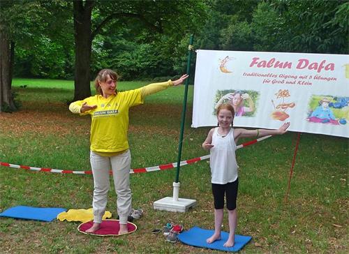 法轮功学员在节日上演示了五套功法,并教孩子们叠莲花。学员们的活动吸引了许多游客,很多家长和孩子现场学功。