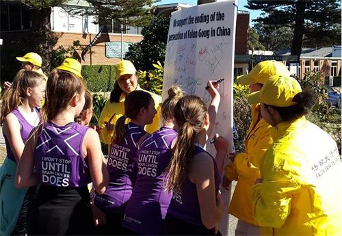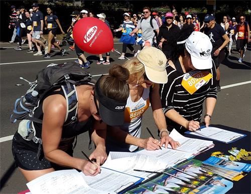 一年一度的“从城市到海滩”活动已经拥有四十八年的悠久而富有启发性的历史。今年有超过八万来自世界各地的兴趣跑步者从悉尼的中央商务区跑到邦迪海滩,抱着实现自我人性的美好和积极为超过900家慈善机构募捐的善良愿望参与此活动,这使整个活动焕发着美好与积极向上的能量场。这些各界志愿者们,当相遇正在路旁炼功的法轮功团体发出纯正的能量场时,自然就会互相激励,好多人大声表达他们的支持:“法轮大法好!”“你们是最棒的!”“祝你们好运!”“你们将赢得胜利!”“感谢法轮功!”还有很多人走到法轮功展位里,有的拿起笔就直接签名支持法轮功反迫害;有的径直走入并站在法轮功团体中学着炼功;还有的人问询在哪里可以学炼法轮功。