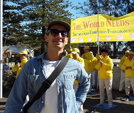 年轻人爱德华(Edward)和迪杰(DJ)被法轮功强大的正的能量吸引着,直接走入炼功队伍,他们表示炼了几分钟就感觉很舒服,平时因为自己很忙,无暇静下来,这次正好遇见法轮功,炼完功后,他们表示还想回去继续了解更多法轮功真相。
