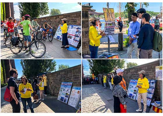 进入夏季以来,法轮功学员每天上午都会来到斯德哥尔摩市政厅的入口处,向瑞典民众及来自世界各地的游客展示法轮功的美好,同时揭露中共迫害法轮功及活体摘取法轮功学员器官的真相。