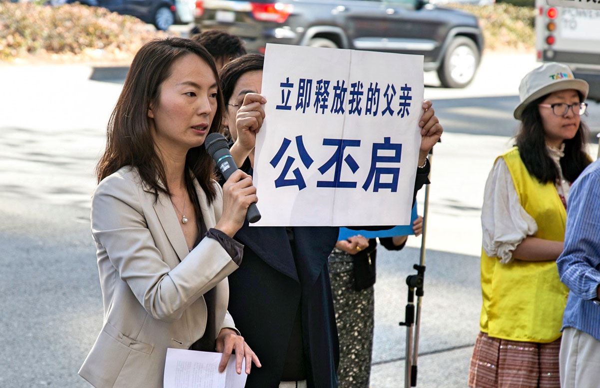 集会上,在旧金山湾区硅谷工作的公丕启的女儿公晓燕在发言中介绍了全家认识法轮功,及父亲修炼法轮功后身心受益的经历,揭露青岛警察对全家人的迫害。公晓燕说:“父亲是一名退休上校军官,国内的官场一直充斥着贪污和腐败,而军队系统中这些问题则更为严重。父亲修炼法轮功之前,每天三包烟,抽的都是别人送的高档烟,饭局和酒局更是天天有,修炼之后烟酒一下子全部戒掉,再没有碰过。工作中也是廉洁奉公,两袖清风,除了工资所得之外没有贪污过一分钱,可以说是污浊的军队官场中的一股清风。”