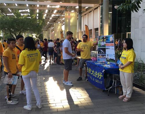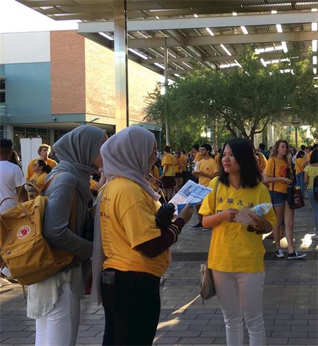 八月十五日是校园的迎新活动,活动大厅里充满了来自全世界各地的人。活动期间,法轮大法社团应邀到舞台表演五套功法,吸引了众多学生。在法轮功的真相摊位前,两位学员展示功法,一人炼四套动功,一人打坐。很多学生见此场景,表现出好奇的目光,学员借此上前向他们介绍大法,很多人对此赞叹,当听到校园内有大法社团可以免费教功时,很多人都留下了联系方式,表示想来进一步了解。