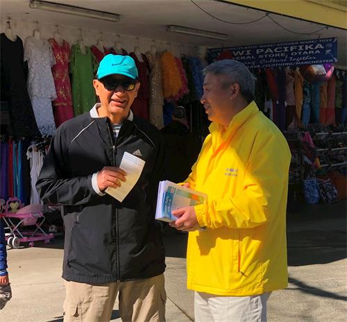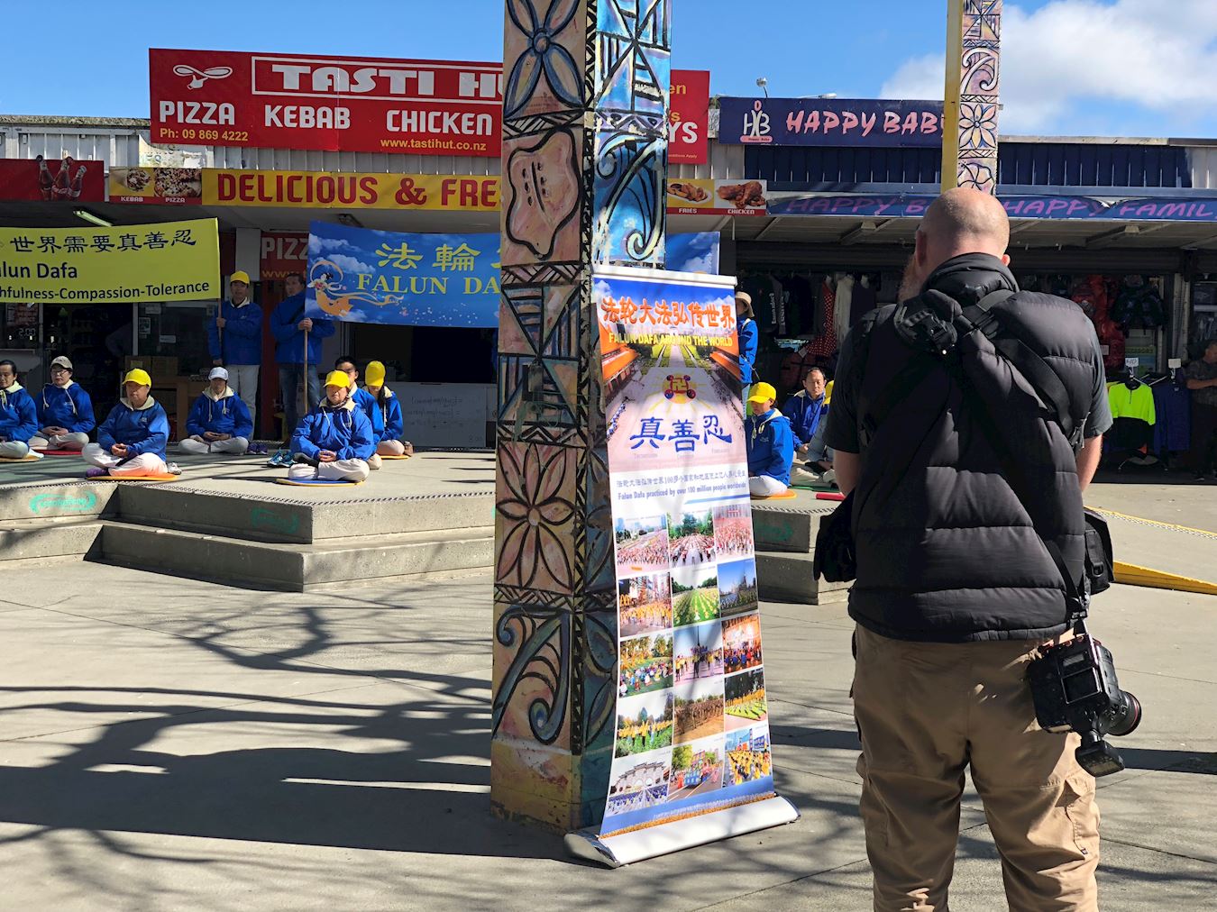 新西兰最大的新闻网站(Stuff)也有记者和摄影师来录当地新闻。着装整齐,动作优美,祥和宁静的法轮功学员在舞台上的功法表演,立即吸引了他们的目光。录制完后,他们又细心地听法轮功学员讲述在中国发生的骇人听闻的迫害真相,还拿了法轮功真相资料,说回去后,要好好了解一下。