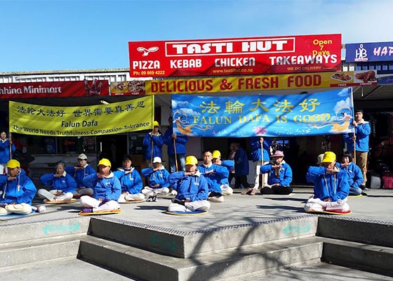 奥克兰南区最大的玻里尼西亚集市的小舞台上,随着优美的音乐,法轮功学员向人们展示五套功法,功法动作舒缓优美,不少人驻足观看。