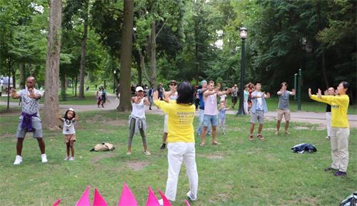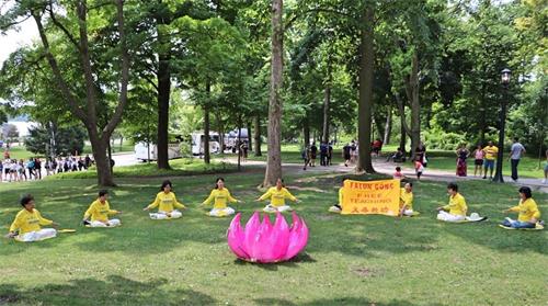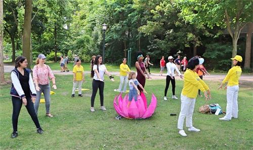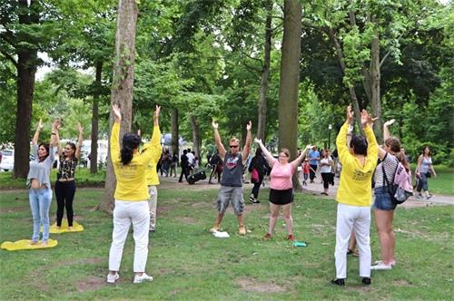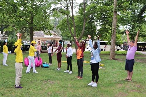 多伦多法轮功学员从今年七月开始,每个周六都有三、四辆车,从多伦多开一个半小时的路程来到这里给游客介绍法轮功,并义务教功,游客们踊跃学法轮功功法。学完功法后,他们纷纷感谢法轮功学员。