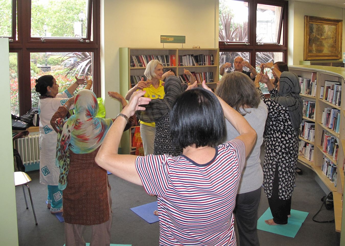 孟加拉女士苏拉亚(Suraya,戴眼镜女士)住在市政中心附近,默顿图书馆门口的法轮功展板吸引了她的注意力,图书馆工作人员告诉她这里设有法轮功义务教功班,于是她来了,而且带她的朋友俩俩相继而来。八月十四日是她第三次来,当天与她同来的三位女士分别是第一次、第二次和第三次来。炼功结束后,四位女士围着乔伊问怎么才能平时在家自己炼,乔伊告诉她们从互联网上下载炼功音乐的方法,几位女士还高兴地发现法轮大法网站有四十多种语言的版本,其中包括孟加拉语。
