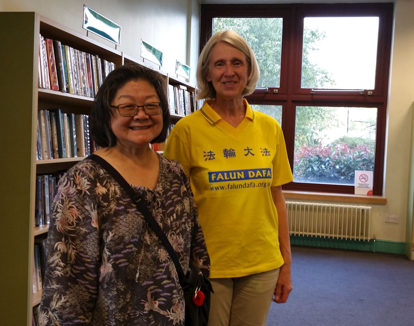 '图5:二零一八年八月十四日下午,法轮功学员乔伊和七年来坚持到默顿图书馆教功班上炼功的华裔女士梅合影'