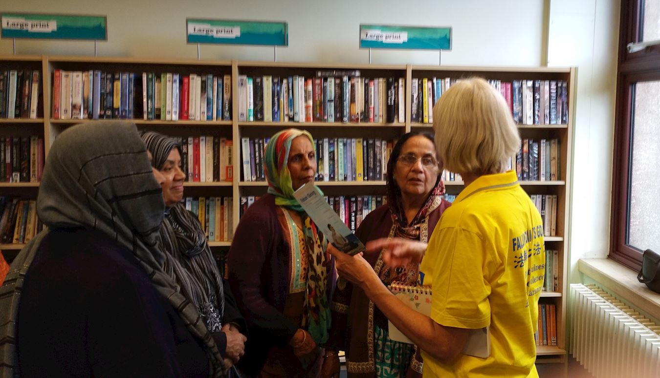 图6:二零一八年八月十四日下午,法轮功学员乔伊与四位新近到默顿图书馆教功班上学功的孟加拉裔女士交谈。