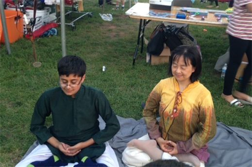 有的人跟着学员炼了很长时间,家人来催促好几次才依依不舍的离开;一位女士学炼了一会儿以后马上表示要到周六的炼功点接着学;还有一个七岁的小姑娘也跟着学员开始打坐,学员还教了她“真善忍”三个汉字。不一会儿,她又带回一个五岁的小男孩,也想要学员折叠的纸莲花,学员又带他重复了一次炼功及念“真善忍”。不多久,她又带来另一位小男孩,这次孩子们的母亲也来了,母亲在一边静静地看着学员教她的孩子们炼打坐、念“真善忍”,给了莲花后,孩子们临走前笑得好开心。