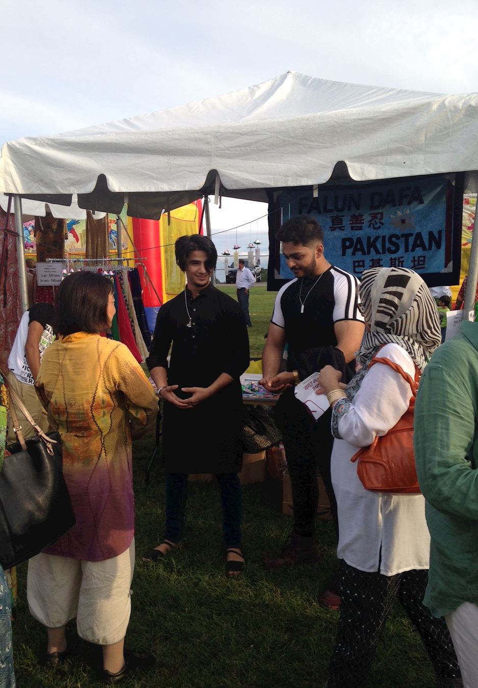 过往的很多巴基斯坦裔民众被学员们祥和的炼功场景吸引,围着停了下来。这时发资料的学员就走上前去递上法轮功真相传单;有的人自己到桌子上拿走真相传单。