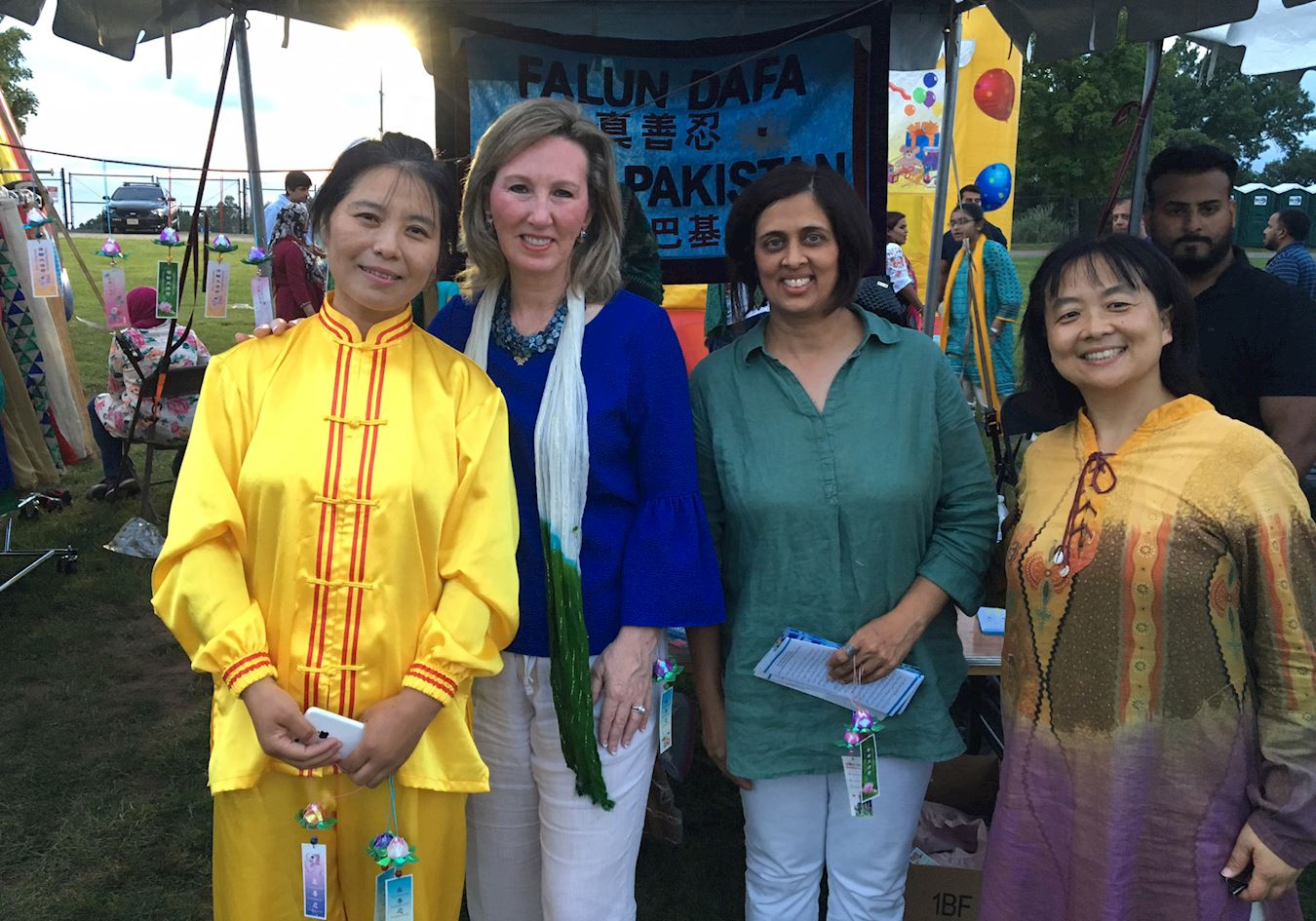 活动持续到晚上九点,法轮功学员们也坚持到最后,并向邻居摊位的人们介绍法轮功。一位隔壁摊位的女士来自马里兰州,学员告诉她那里也有法轮功的炼功点,那里的学员也是免费义务教功,那位摊主听后很高兴,赶快留下了带有联系信息的真相传单。