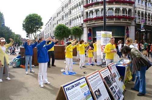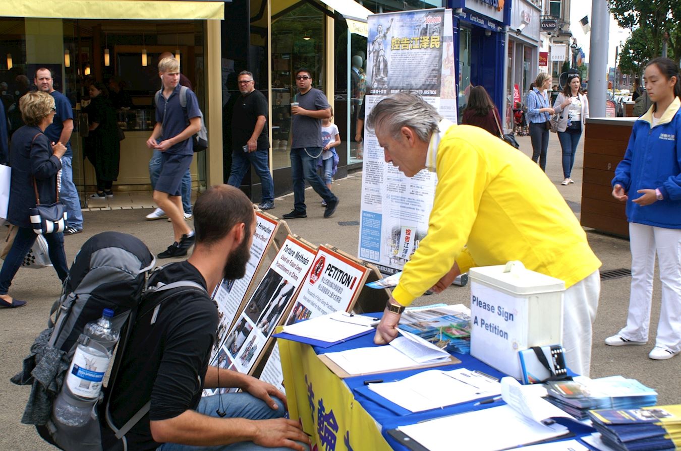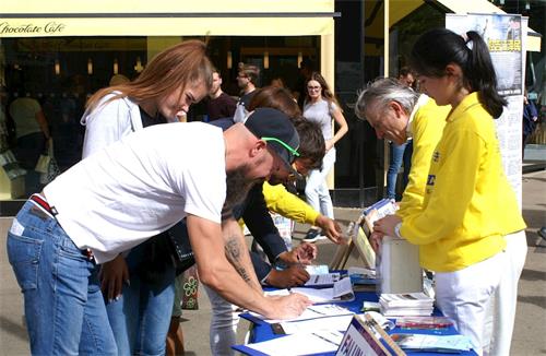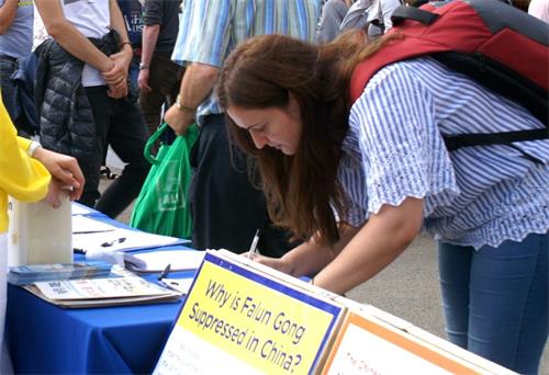 下午的时候,一位年轻的女士看着学员炼功看了很久,最后她在制止迫害的签名表上签名。她问一位西人学员,法轮功是否真的对健康有帮助。学员于是和她攀谈起来,还邀请她参加学功班。她离开前跟学员说,她觉得学员们看上去都是非常好的人。