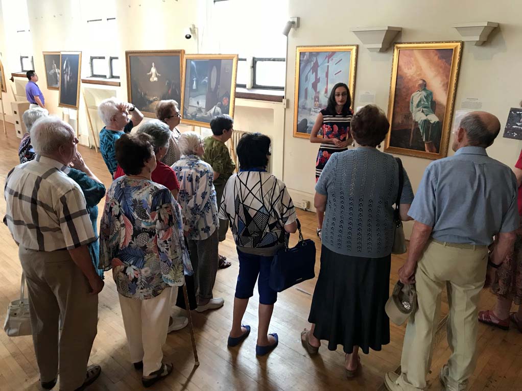 本次画展的很多画作的介绍都被乌克兰和俄罗斯法轮功学员们翻译成了俄文,因此,很多克利夫兰老年中心俄罗斯的游客能够来参加画展,能够深刻了解和欣赏每一幅画作。