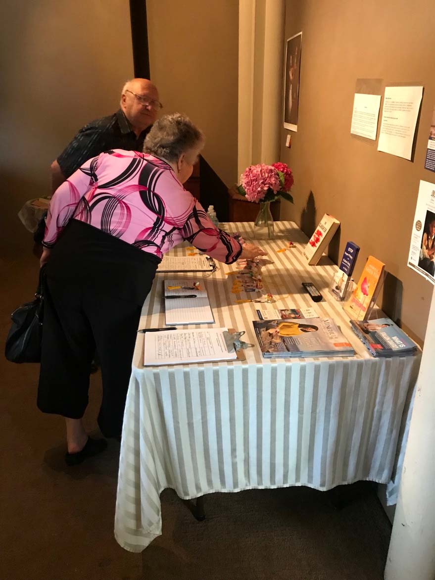 游客在留言薄上留言,拿取莲花书签和真相传单