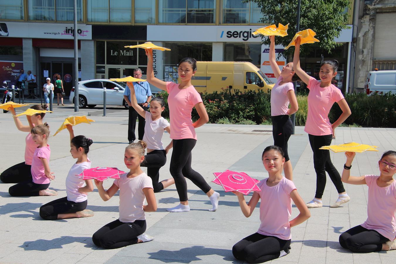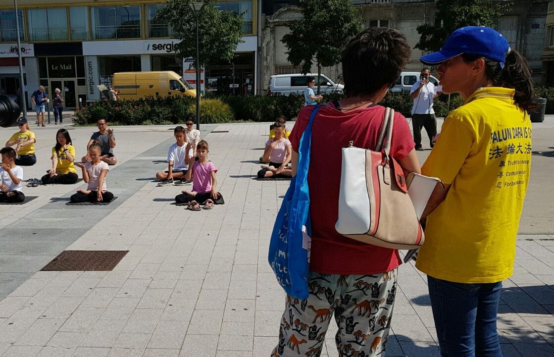 夏令营的最后一天,孩子们来到昂热市的一个讲真相展台,他们不仅演示了法轮功的五套功法,还表演了自己排演的小节目,共同合唱了“为你而来”等歌曲。这是法轮功学员第一次在该市向民众展示功法及在中国遭受迫害的真相。