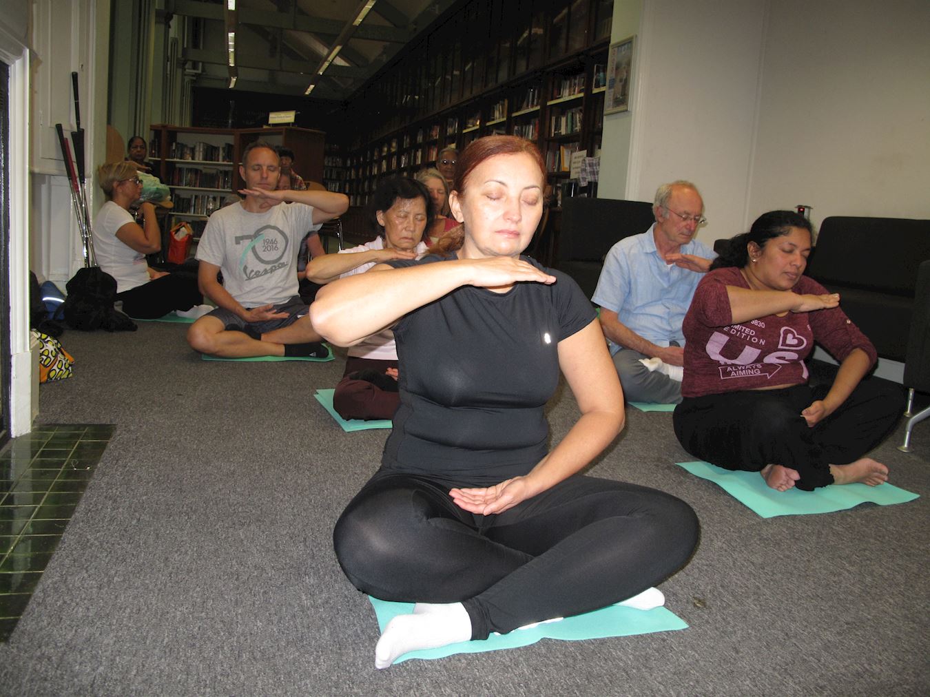 图1:二零一八年八月十八日,温布尔登图书馆的法轮功义务教功班上,法轮功学员温迪(Wendy)和大家一起炼功